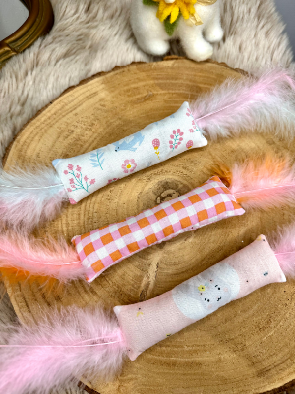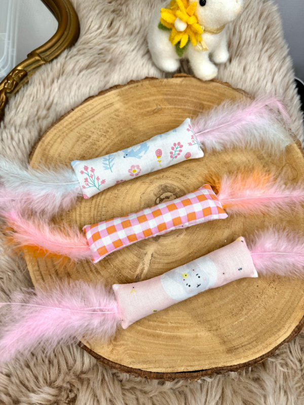 Chaque jouet est cousu, rempli et préparé à la main, ce qui rend chaque pièce unique — un petit trésor artisanal pour votre chat.