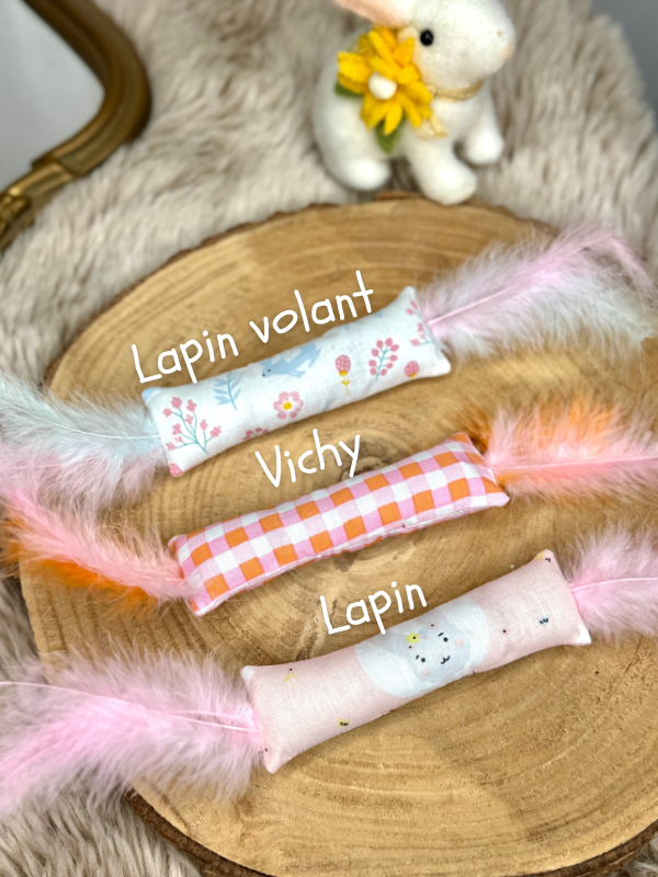 Notre Cou-Stick spécial Pâques est un jouet pour chat fabriqué à la main, pensé pour éveiller l’instinct de chasseur de votre petit félin tout en ajoutant une touche festive et printanière.