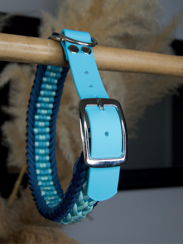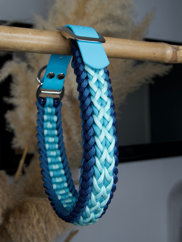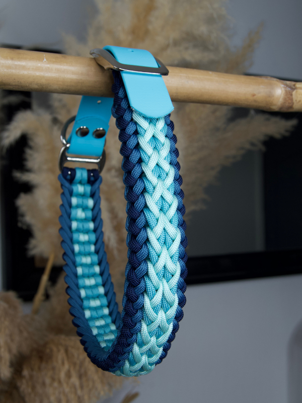 Le collier Ankaa est entièrement fabriqué à la main, avec un tressage en paracorde à 4 brins aux couleurs Midnight blue, Pastel turquoise, Mint blue et Petrol bleu. Il est monté sur un adaptateur réglable en biothane Skyan bleu 25mm, résistant et facile d’entretien.