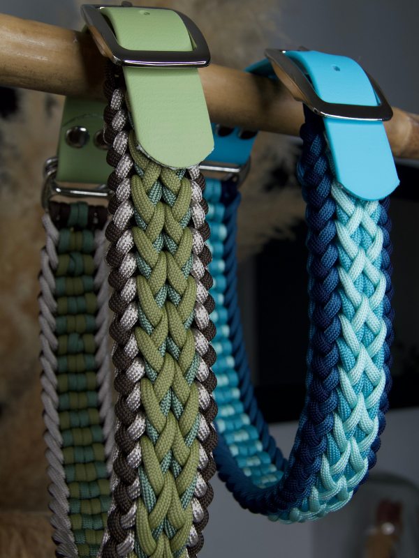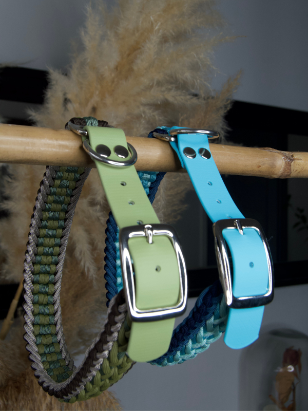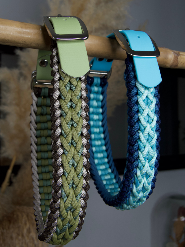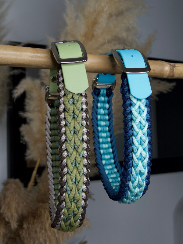 Le collier Ankaa est une pièce sur-mesure, entièrement fabriquée à la main par mes soins. Chaque collier est tressé individuellement en paracorde (4 brins) et monté sur une base ajustable en biothane de 25 mm, un matériau reconnu pour sa solidité, son confort et sa simplicité d’entretien.