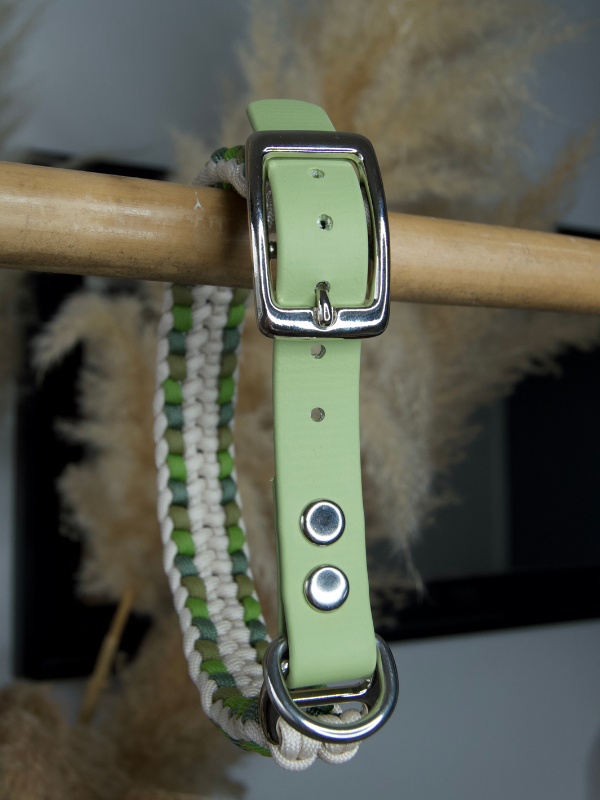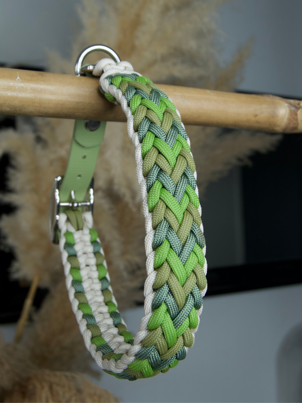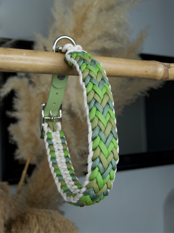 Le collier Comète est entièrement fabriqué à la main, avec un tressage en paracorde à 4 brins aux couleurs Crème, Moss, Foggy vert et Leaf vert. Il est monté sur un adaptateur réglable en biothane vert Holy Guacamole 20mm, résistant et facile d’entretien.