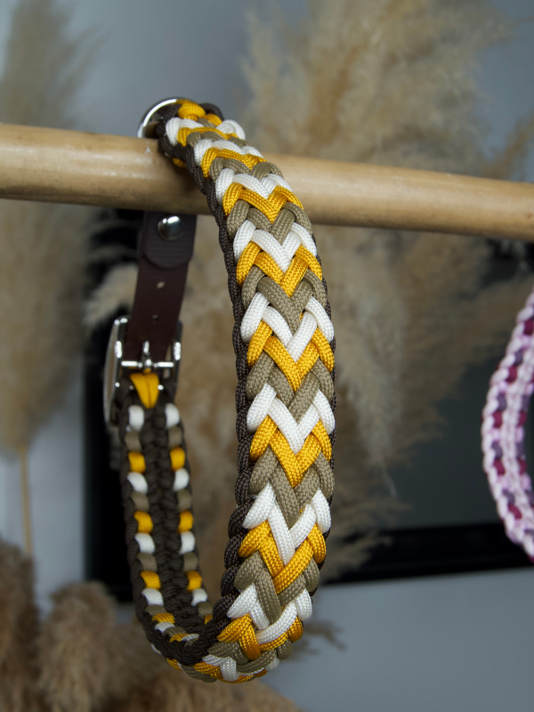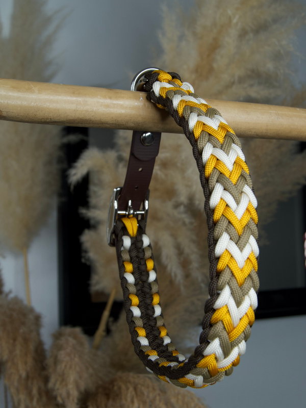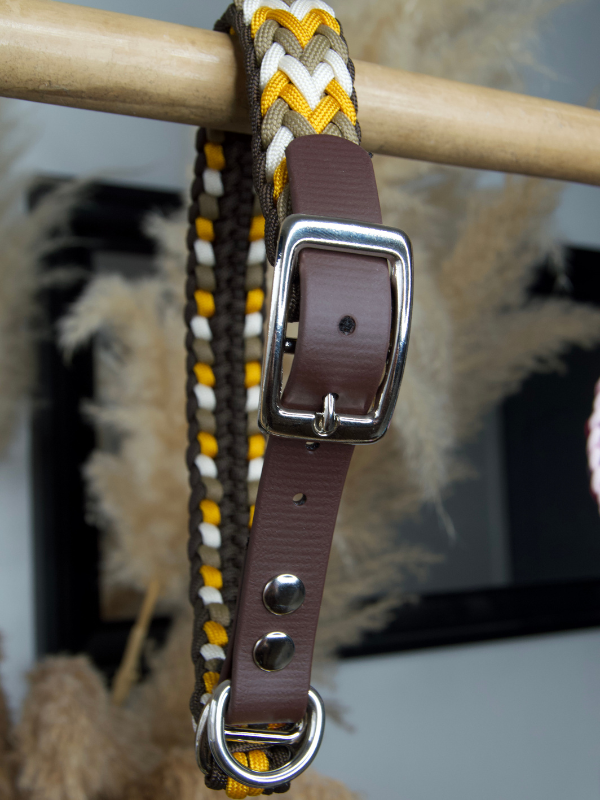 Le collier Comète est entièrement fabriqué à la main, avec un tressage en paracorde à 4 brins aux couleurs sandcastle tan, goldenrod, crème et espresso marron. Il est monté sur un adaptateur réglable en biothane marron foncé 20mm, résistant et facile d’entretien.