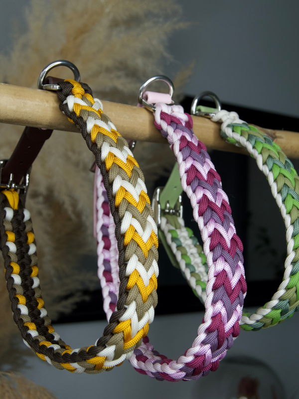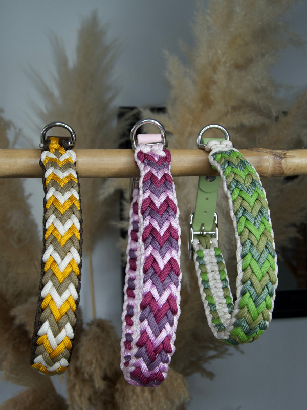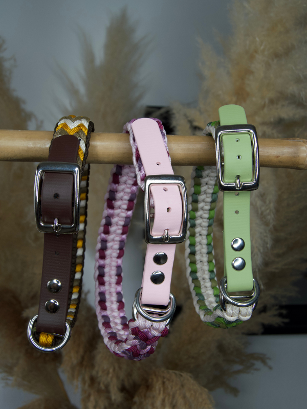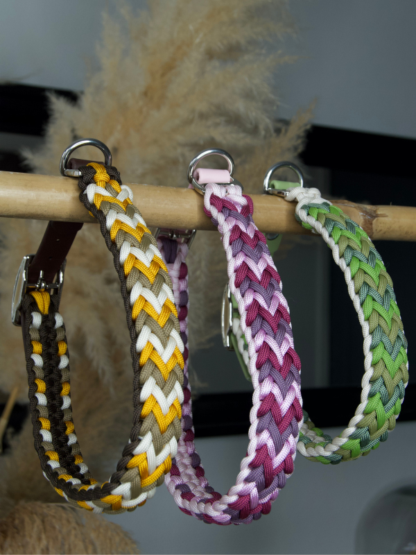 Collier sur-mesure et entièrement fabriqué à la main par mes soins, en tressage de paracorde (4 cordes) et biothane. Chaque pièce est réalisée une à une pour créer un collier unique, solide et stylé pour votre chien.