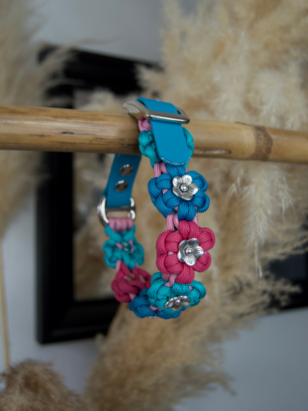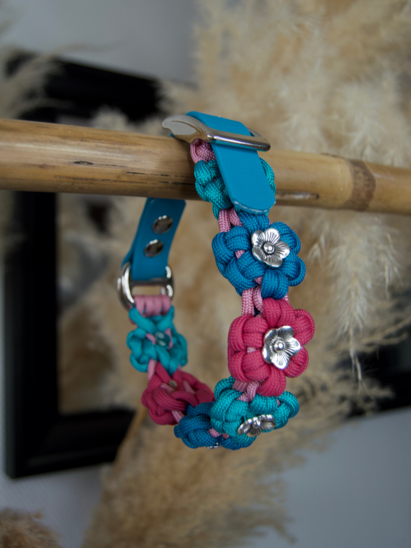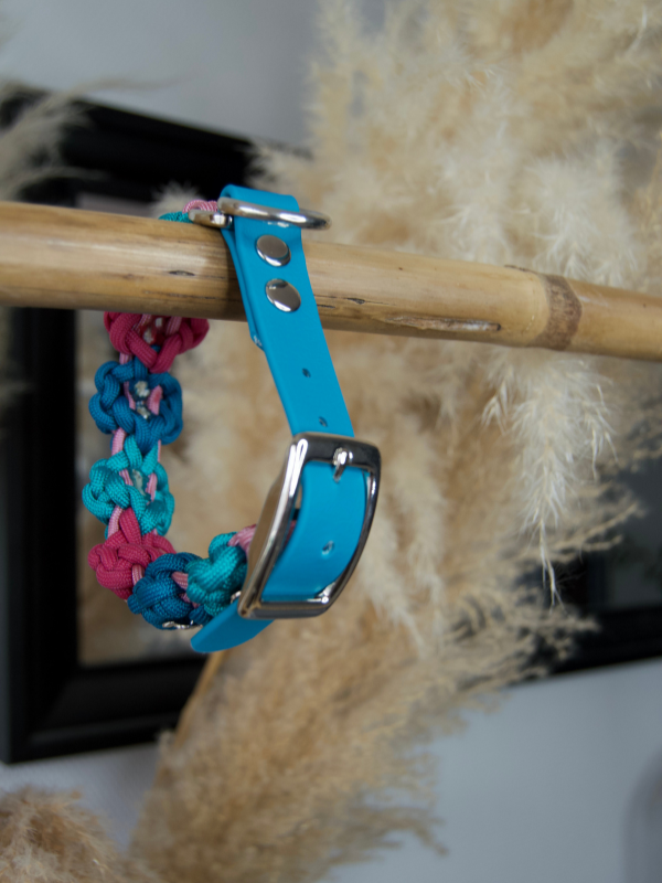 Le collier Truffe 🌸 est entièrement fabriqué à la main, avec un tressage en paracorde à 4 brins aux couleurs Fuchsia, Lavender rose, Aquamarine bleu & Caribbean bleu. Il est monté sur un adaptateur réglable en biothane Lagune 20mm, résistant et facile d’entretien.