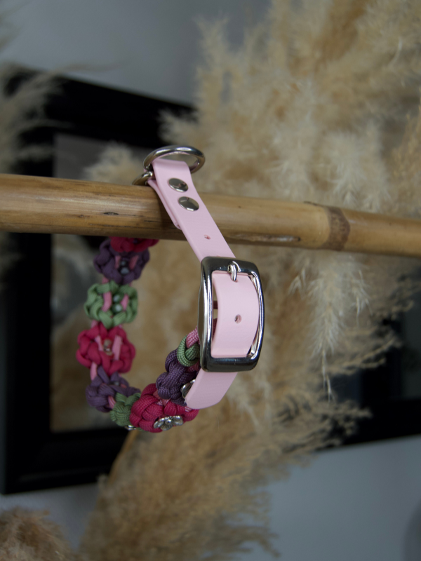 Le collier Truffe 🌸 est entièrement fabriqué à la main, avec un tressage en paracorde à 4 brins aux couleurs Marvelous mauve, Fuchsia, Holy guacamole & Lavender rose. Il est monté sur un adaptateur réglable en biothane Dusty light rose 20mm, résistant et facile d’entretien.